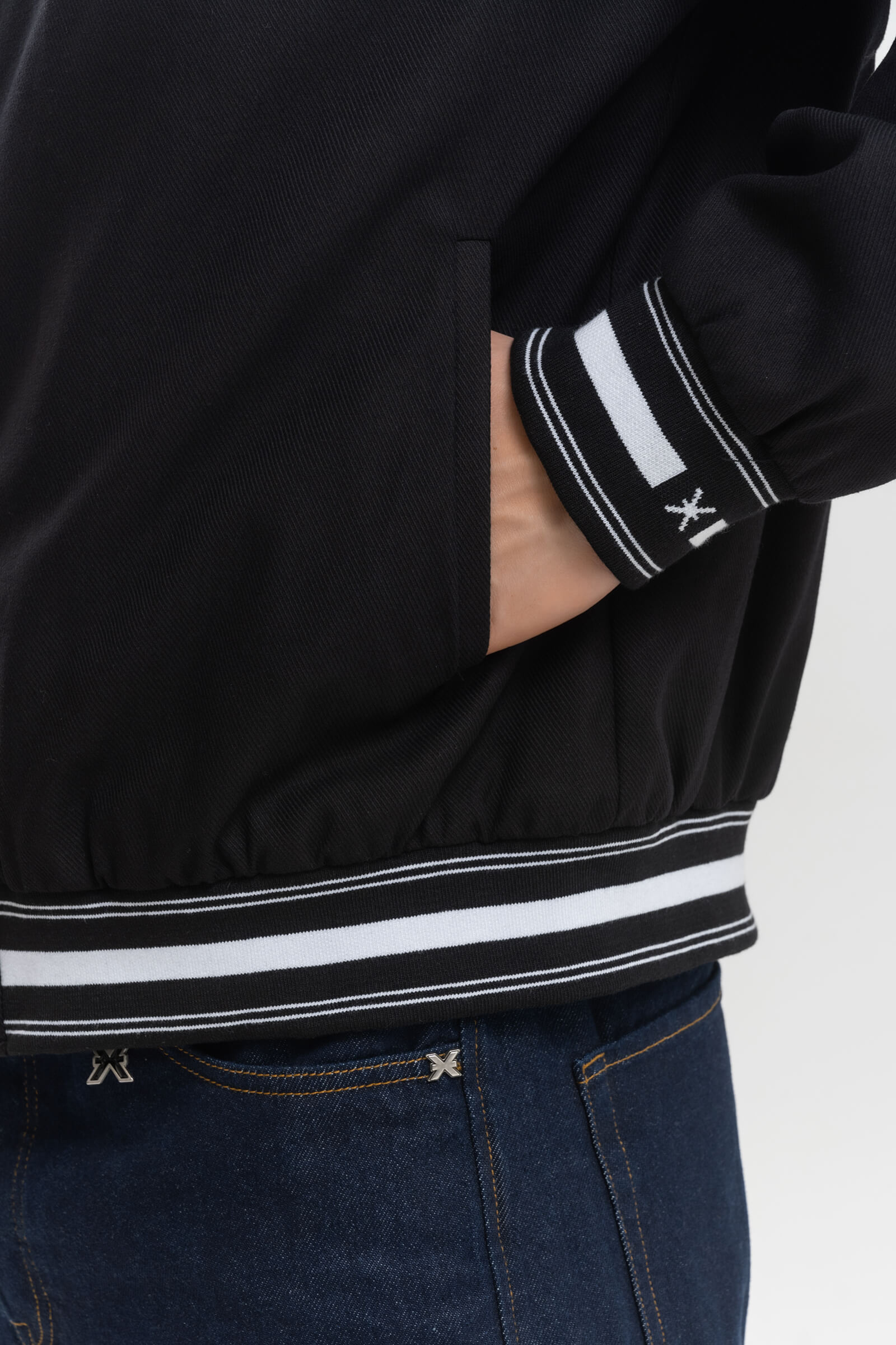 - Эластичные трикотажные манжеты и пояс с принтом полоска